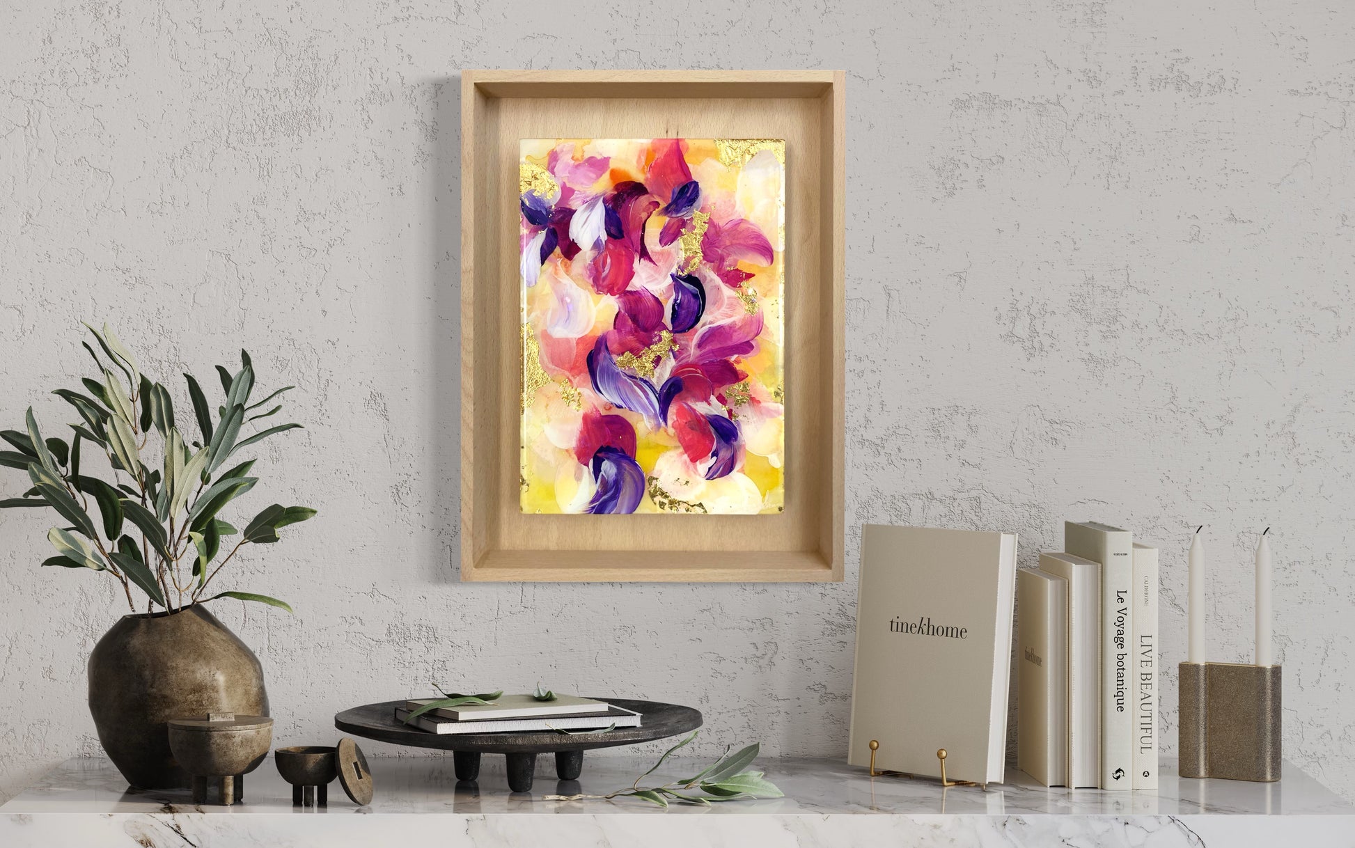 Original painting of 30 x 40 cm and wood frame with acrylic, pigment ink, oil pastel and resin. Creation date 2023.